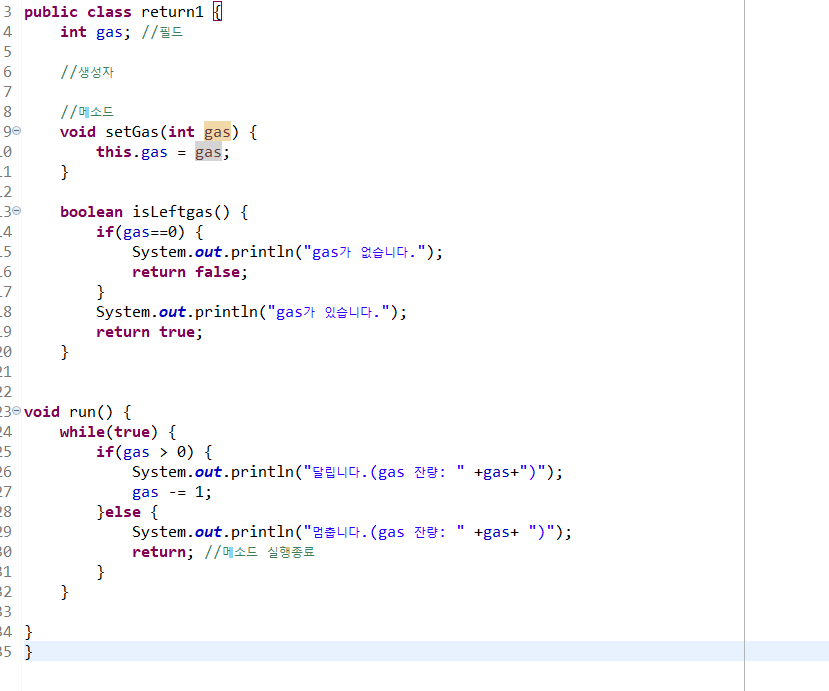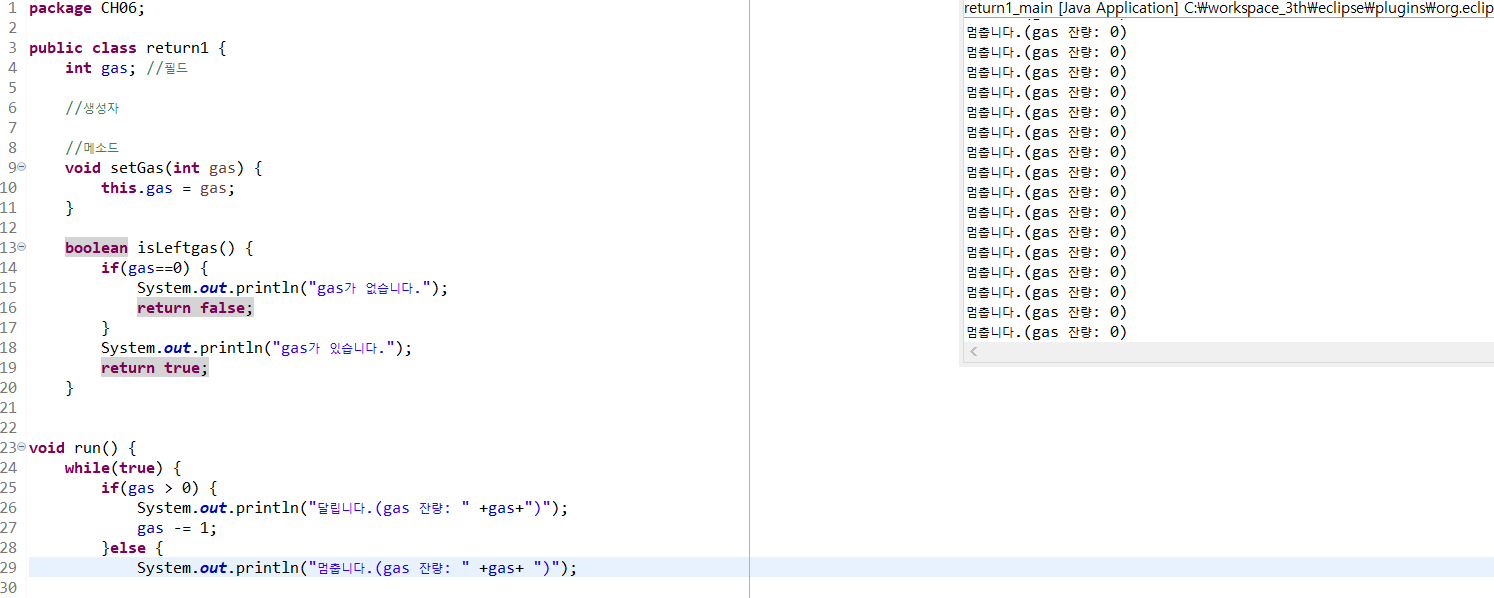 이 처럼 반환값이 없어 리턴값을 받지 못하는 타입의 메서드에도 return을 만나게 되면 메소드의 실행을 멈춰버리는 기능 또 한 가지고 있다.