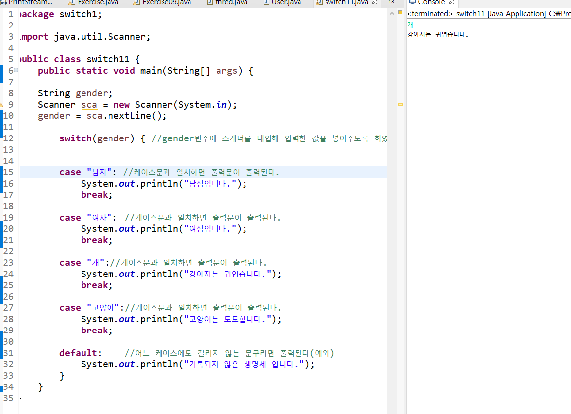 case와 입력값이 같아야 그 해당 값이 출력이 되는 예제이다.